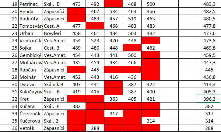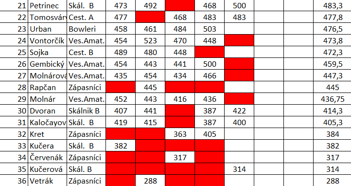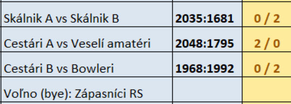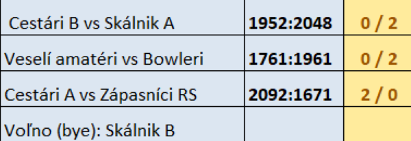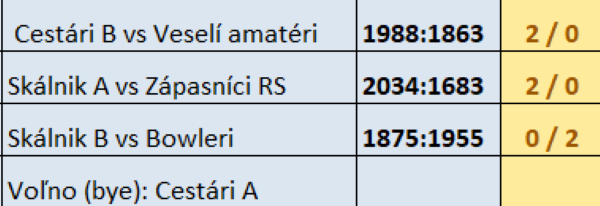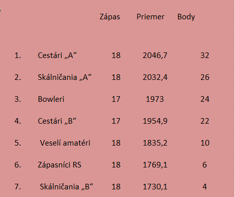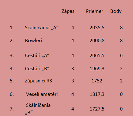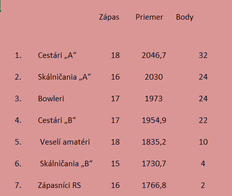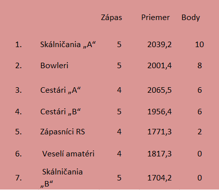 1.miesto - Skálničania "A" 2.miesto - Cestári " A " 3.miesto - Nádeje 4.miesto - Bowleri 5.miesto - Skálničania "B" 6.miesto - MsÚ RS 7. miesto - Cestári "B" 8.miesto - Zápasníci |